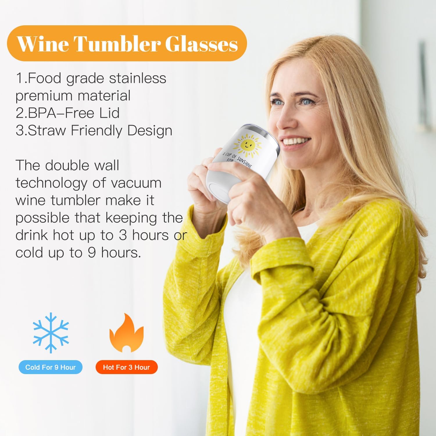 12oz Exquisite Wine TumblerUnique "A cup of sunshine for you" quote will put her into good vibes. It can keep cold drinks warm for 9h/hot drinks for 3h. she can drink a glass of cold beer in summer and a cup of fragrant hot coffee in winter. |