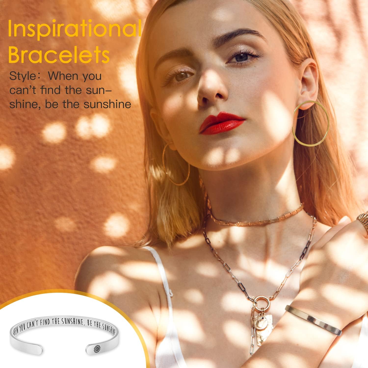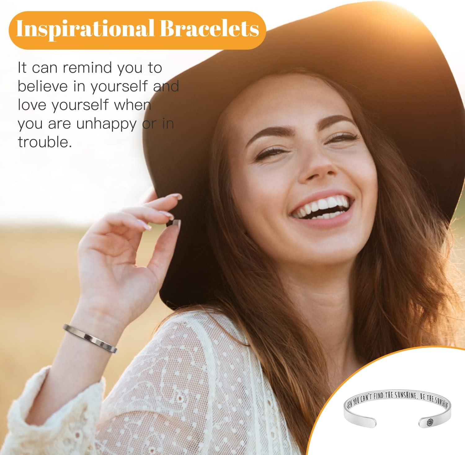 Inspirational BraceletsHigh polished cuff bracelet, shinning surface, adjustable size to fit most wrist sizes, featuring inspirational phrase "When you can't find the sunshine, be the sunshine", to help remind and encourage yourself to be confident and brave. |