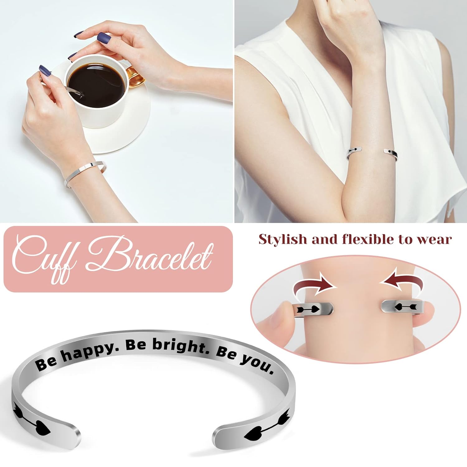 Bracelets for Women Inspirational GiftsMade of 316L stainless steel. With the words "Be happy. Be bright .Be you". It will not rust,stain or corrosion.And will never fade,peel or crack. It's a perfect gifts for Graduation, birthday ,Christmas. |