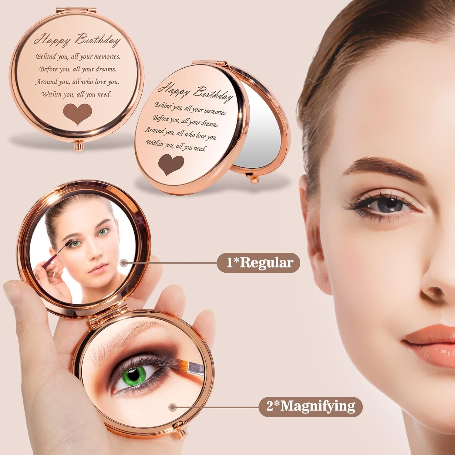 Rose Gold MirrorDelicately etched with the funny quote “Happy Birthday”, the compact mirror is designed with a standard side and a 2-magnification side. Easily fits into handbag or cosmetic bag anytime anywhere. |