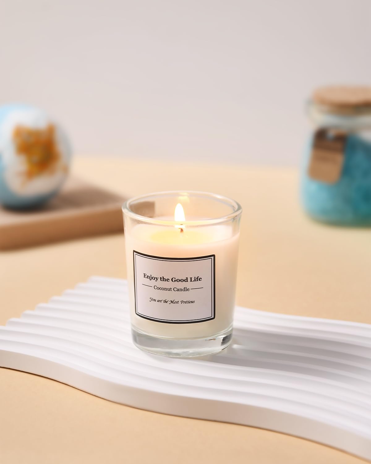 - Best Christmas Women Relaxation Gifts: 6 in 1 luxury gift for women, designed to provide every woman with a caring experience worth having. Each gift box contains a stainless steel insulated cup with a straw. 1 x coconut flavor scented candles, 1 x handmade diamond soap, 1 x ocean flavor bath salt, 1 x ocean flavor Bath Bomb, 1 x g card. The moment the box is opened, it can bring her a great surprise